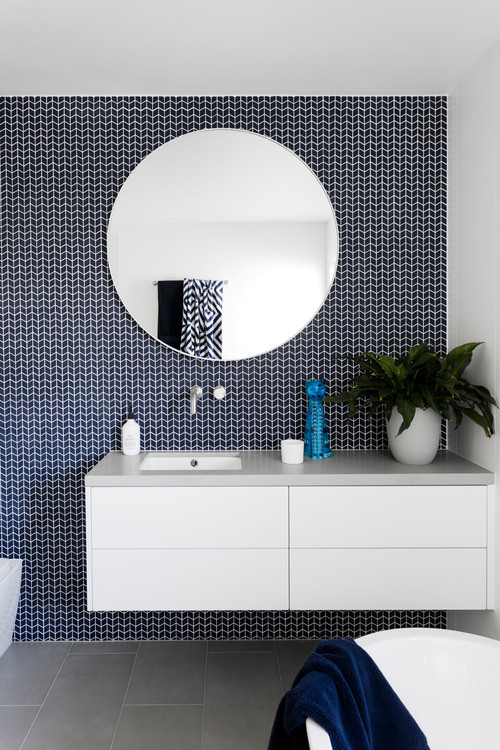 In this small beach-style bathroom, the gray glass backsplash with geometric patterns provides a neutral background! The white floating vanity topped with a marble countertop brightens up the space while the gray color brings a sense of flexibility. The circular mirror is flanked by two chrome sconces that compose a chic and smooth scene together.