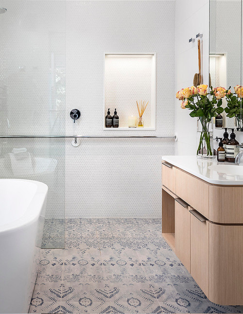 Wood-Look Porcelain Bathroom Floor Tiles with Hexagon Tiled Accent Wall