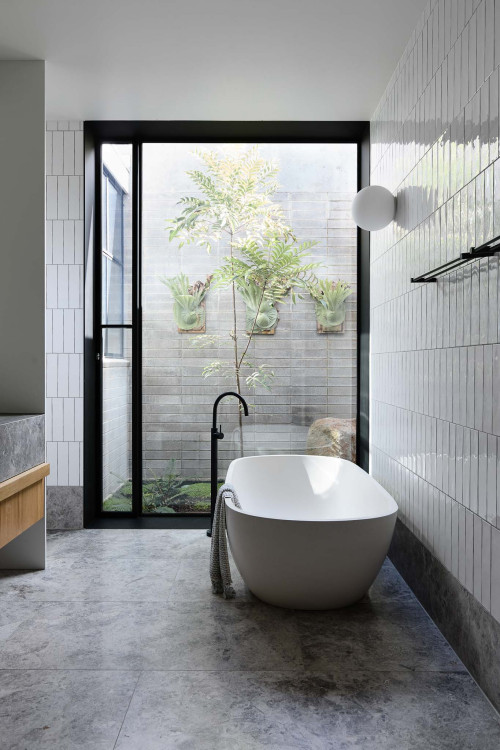 White Freestanding Tub with Large Hexagon Bathroom Floor Tiles