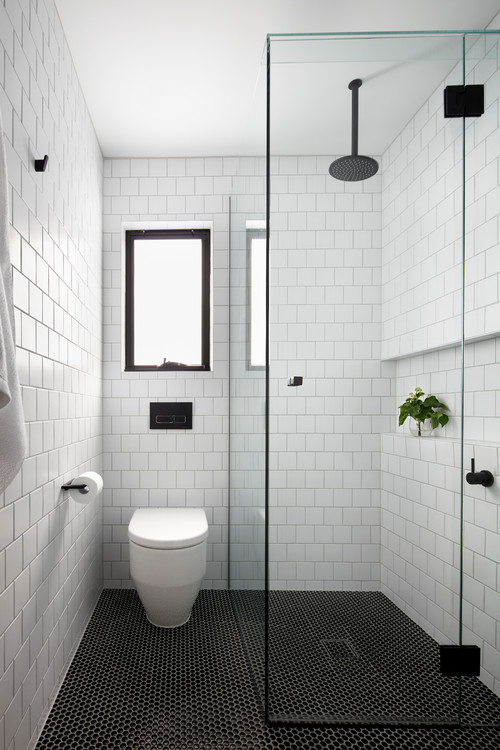Patterned Bathroom Floor Tiles with Black Hexagon Tiles for a Contemporary Bathroom