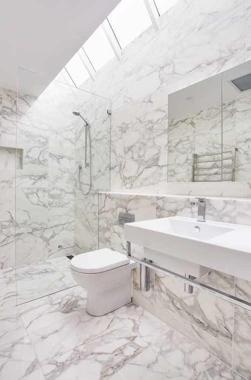 Large Black Bathroom Floor Tiles with Marble-Look Wall Tiles