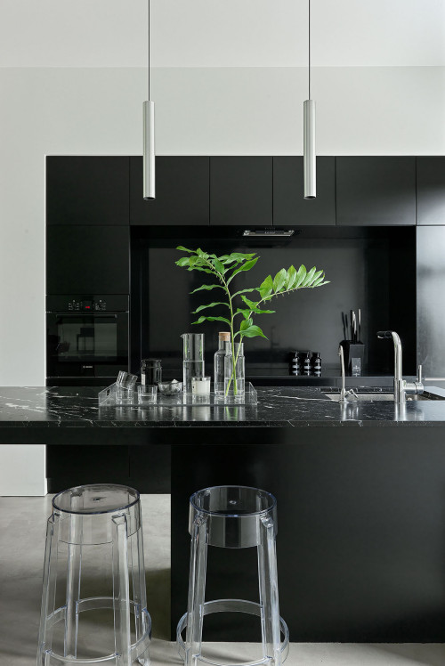 The black kitchen cabinets and island create a sleek and sophisticated look while the black and white quartz countertops and backsplash create contrast against the blacks to add a bright and fresh look. The large counter space of the island provide a plenty of space for both working and entertaining. Using black floating shelves instead of upper cabinets brings an open and airy feel to the atmosphere. The glass pendant lights above the island enhance this spacious feel.