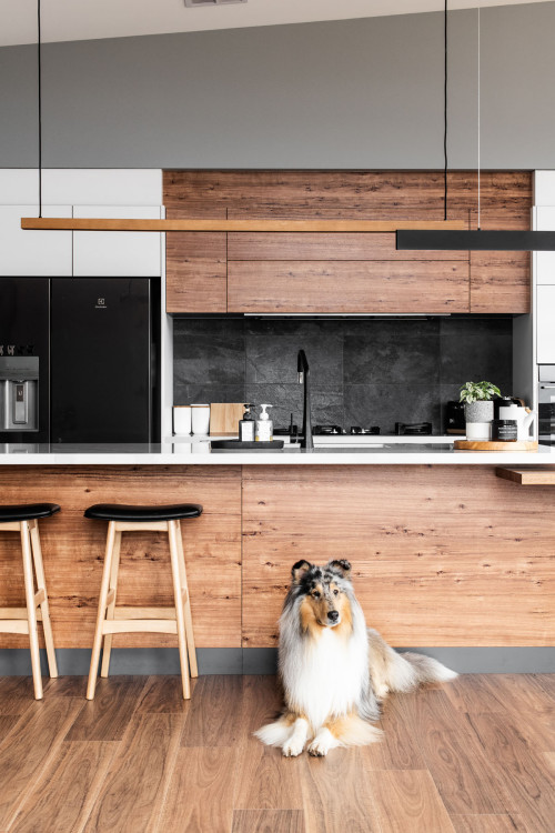 Black backsplash with white countertops come together with wooden details to form a perfect whole. In the kitchen, which captures the modern line with classical preferences, the patterns and details on the black backsplash create elegance. The white countertop provides a unique harmony with the white cabinets. Black splash is a perfect complement between the wooden cabinets and the white countertop, like a puzzle piece. The warmth that the wooden cabinets add to the environment continues on the white cabinet handles. The warm tones preferred on the floor also ensure that every detail is in harmony. In terms of the preferred hearth color and very modern design, it achieves a unique harmony with the black backsplash.