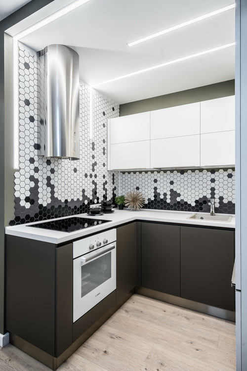 A perfect reflection of the harmony of contrasting colors, the black backsplash with white countertops perfectly expresses simplicity with its patterned structure. The unique integration of cabinets and countertops gains depth thanks to the black backsplash. The dark tones preferred on the floor make the white cabinets and counters used in the area stand out, just like the black backsplash. The simple and elegant image created by the white color is detailed with a black splash.