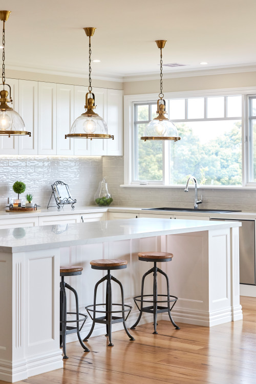 Farmhouse Kitchen with White Backsplash and Brass Pendants