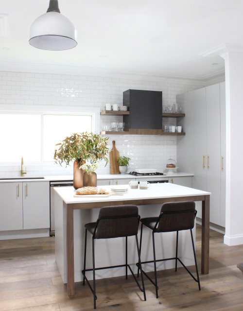 This traditional kitchen is adorned with elegant shades of gray! While the light gray cabinets, white backsplash, and countertop create a sleek and fresh backdrop, the black island creates a focal point by making a statement. The open shelving provides a visual interest besides its storage function. The stone-look floor tiles and the glass pendant lights above the island make a beautiful final touch.