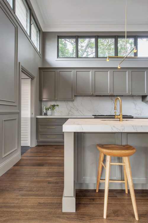 Gray Cabinets with Brass Hardware and Quartz Backsplash
