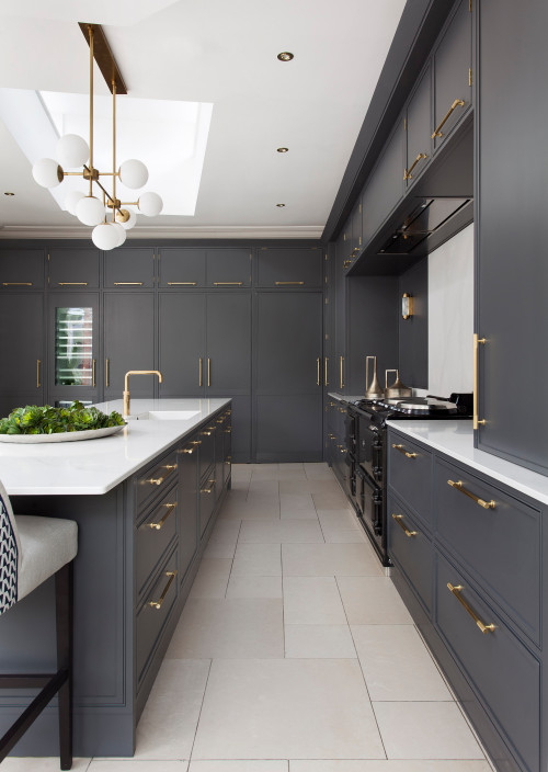 Gray Kitchen Cabinets with Polished Brass Hardware