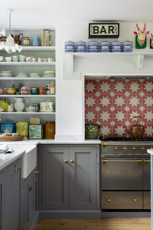 With its unique details, this farmhouse kitchen showcases a one-of-a-kind appeal! The red backsplash tiles with a star pattern are the first things that draw attention by creating a focal point. Even dough the backsplash tiles have a vibrant color, this red hue perfectly complements the gray color of the shaker kitchen cabinets. The aged brass hardware and the stainless steel stove add a vintage flair to the space while the open shelves create a visual feast with the kitchen essentials on them!