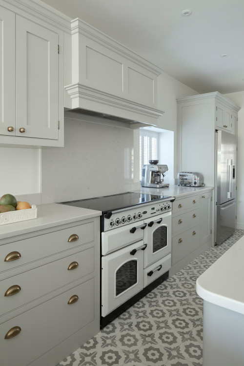 This transitional kitchen offers a sleek sophistication with its gray color scheme. The combination of the light gray cabinets with brass hardware creates a simple yet effective appeal. The white quartz backsplash behind the stove and countertops perfectly completes this elegant look. The gray and white flower-patterned floor tiles make an unexpected twist and enhance visual interest. The white stove makes a beautiful final touch and completes the vintage flair of the overall look.