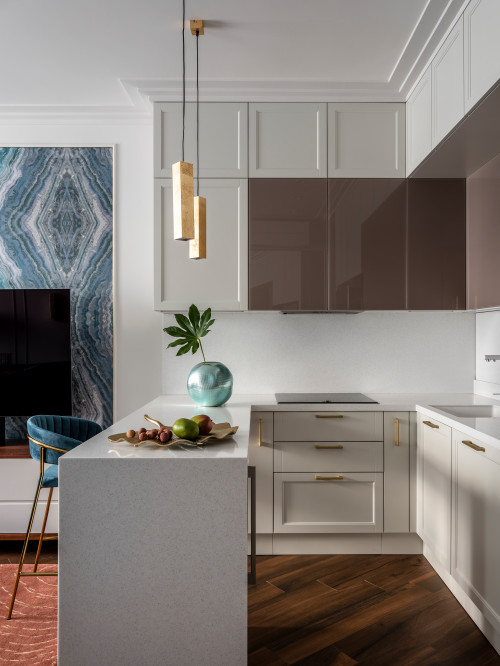 To look at the elements one by one or in groups, the off-white and brown cabinets, and matte and glossy finishes all coordinate well to make a statement. White quartz backsplash and countertops encourage the space to feel more spacious, blending seamlessly with the white walls. So, they are a smart addition to give an illusion of a more spacious area. To accompany the rest, brushed brass hardware is added to orchestrate a sense of warmth, while the diagonally-laid medium wood flooring creates a visual drama, complementing the overall look of the kitchen.