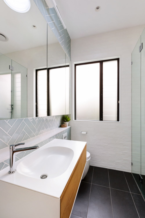 Blue Herringbone Tile Bathroom Backsplash with a Modern Wood Vanity Design