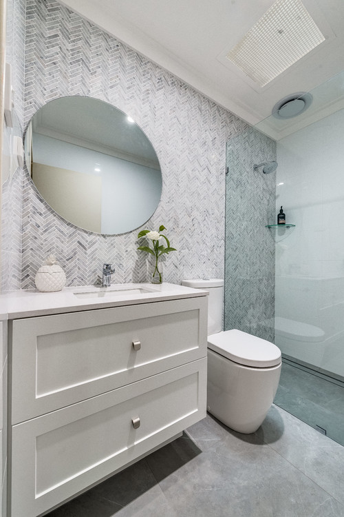 The perfect harmony between the gray herringbone tile backsplash and the light wood floating vanity design provides a stylish appeal in the bathroom! The light wood flat-panel vanity and the white countertops are complemented by the gray herringbone tile backsplash wall. The frameless round mirror creates a contrast to the sharp geometry of the contemporary design style.