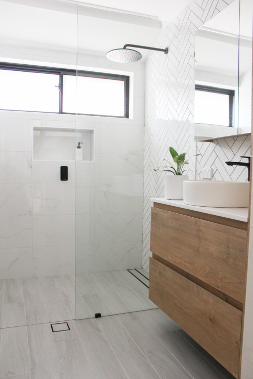 White Herringbone Tile Bathroom Backsplash with a Wood Vanity