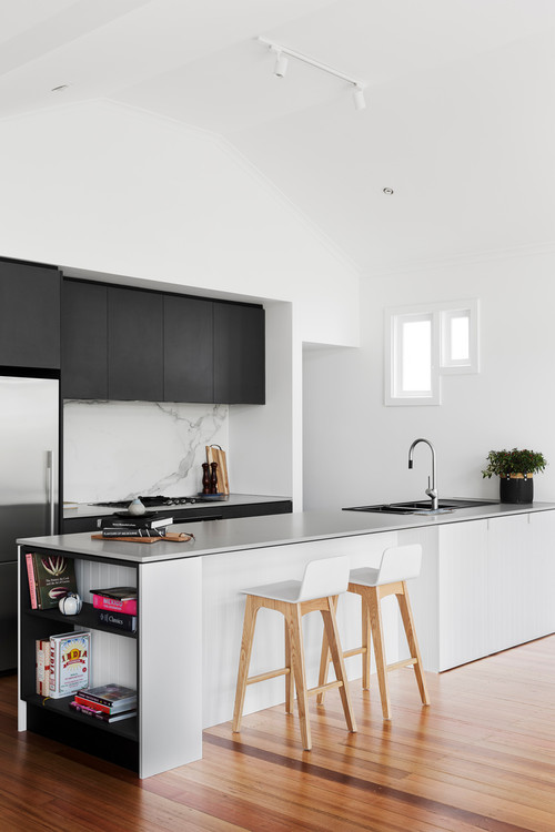 Adding a waterfall countertop is a great way to make a small kitchen look more stylish and bulkier. This contemporary kitchen employs the same strategy and also uses the island to offset the white-and-black color palette. The island is also teamed up with lighting fixtures and wire stools, creating a scene-stealing moment. The black flat-panel cabinets provide a sleek and elegant backdrop for the island while the white countertops and backsplash bring visual interest.