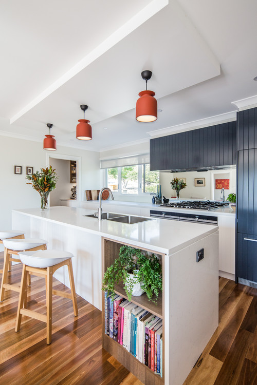 Featuring a white-and-black color scheme, this contemporary kitchen reverses the general rule of thumb of kitchen designs. Unlike the conventional designs, it goes with white counters and black countertops, which works well in this context, thanks to a window backsplash. Opposite it, a kitchen island holds a mirror to the perimeter counters, though with one difference. Its rounded corners add a soft aesthetic feature with open storage that exhibits the essentials of the homeowners. And the most necessitated touch of warmth is introduced via the engineered wood flooring. With its polished finish, it provides another layer of clean and seamless look, adding to the upscale feel of the kitchen.