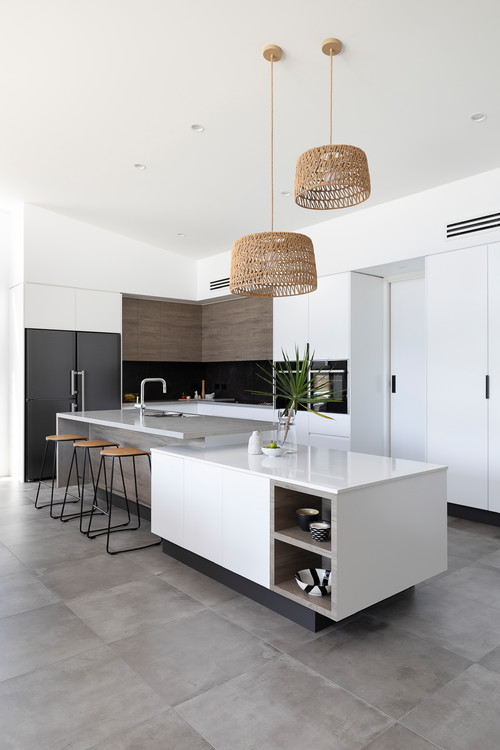 All-white kitchens don’t necessarily have to look jarring or boring. With the right accessories and additions, it can just turn into a different room. Here, for example, this contemporary kitchen treats its all-white color palette with brown stools and black statement lighting fixtures. Reminiscent of cages and oversized, they draw eyes upward, adding a sense of grandeur. A traditional runner in earthy shades also brings in warmth and texture, providing extra comfort underfoot. And a white waterfall island with its narrow design gets the chance to offer seating to more people. The brown vases with dried plants add earthliness, making this all-white kitchen more approachable.