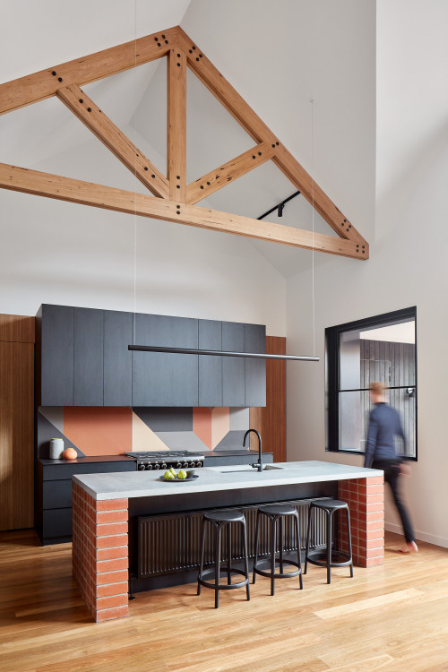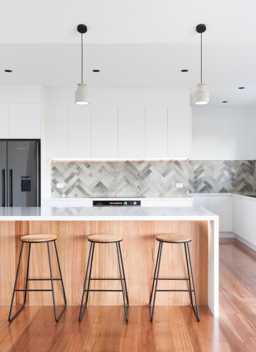 Half-Waterfall Modern Kitchen Island with Seating and Oak Flooring
