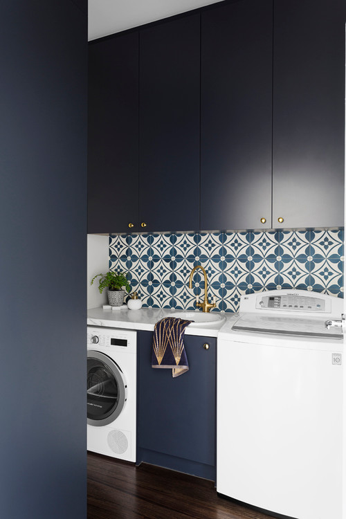 Patterned Laundry Room Floor Tiles with Black Cabinets