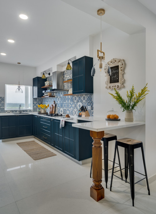 An amazing farmhouse feel sets the tone of the kitchen with a Mediterranean vibe thanks to the patterned tile backsplash. The white ceramic tiles of the backsplash feature beautiful blue patterns that create a striking focal point. Complementing them are white cabinets, white countertops, and a light wood kitchen island that add a dramatic impact with a sense of freshness. Overhead, white flush mounts seem rather modern without looking out of place, while on the floor, the black tiles create a contrast.