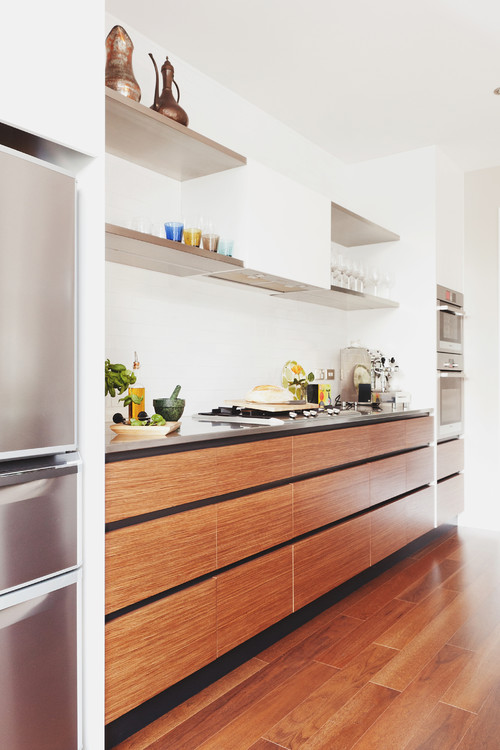 Open Kitchen Storage Ideas with Wood and White Flat Panels