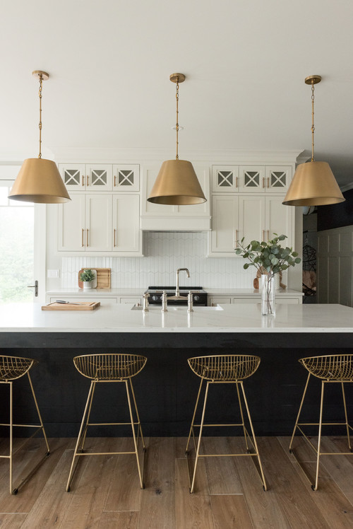 Wood elements will soften the stark contrast and bring warmth to a black-and-white kitchen design! The white island and backsplash give this Scandinavian kitchen a bright, airy appearance while the black cabinets provide a refined sophistication. The square tile backsplash has a classic feel thanks to the grid pattern.