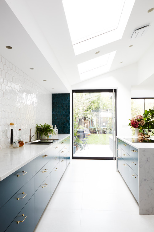 Contemporary Kitchen with White Hexagon Backsplash Tile