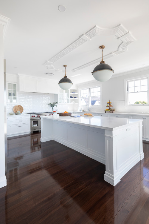 Dark Wood Floors and Island with Shaker Cabinets for a Transitional Design
