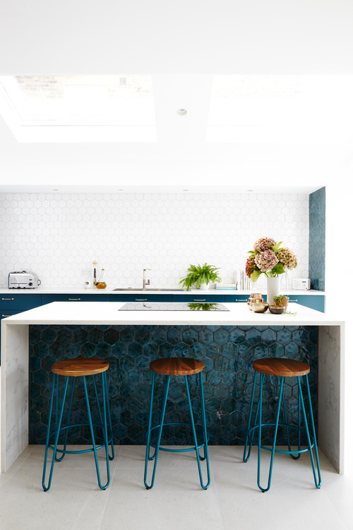 Contemporary kitchens love geometric patterns, soothing colors, and soft contrasts. And this kitchen we have here- generously illuminated by the skylight and full-height window- prides itself on its airy and bright look. The combination of white and wood joinery gives birth to a breathable design, teaming up with a white Escher tile backsplash. In the background, the intertwined hexagons interlock with each other like puzzle pieces. And the use of white grout keeps them modest rather than highlighting them. The black pendants and curved stools break up the formal rectilinear forms, solidifying the kitchen’s aesthetic mood. On the floor, the seamless concrete finish adds an industrial edge, bringing the outdoor vibes in.