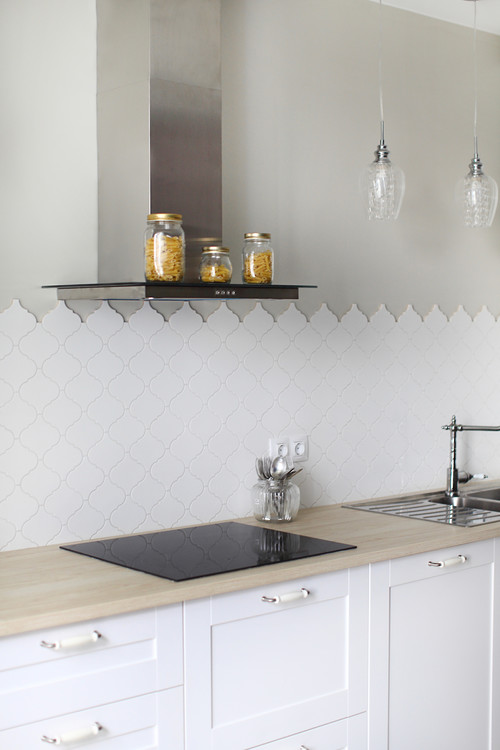 What makes arabesque tiles stand apart from other tiles is that they have curvy forms that break up the masculine and regular lines heavily used in contemporary and minimalist kitchens. So, if you are bored with such well-defined and linear forms, arabesque tiles are the way to go. They look a bit ornamental but without compromising the modern look of the kitchen. Plus, they also offer one of the best forms to use grout colors like gold, blue, and pink. And as for the white arabesque tile backsplash with white grout, it creates a classic and clean look, like any other white tile and white grout combination.