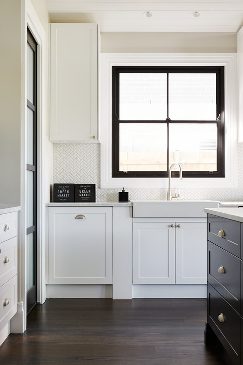 This transitional kitchen is classic and practical, outfitted with white shaker cabinets and a white arabesque tile backsplash. The white grout between the tiles creates a clean and well-groomed background. The black hardware and butler sink give the kitchen a farmhouse flair.
