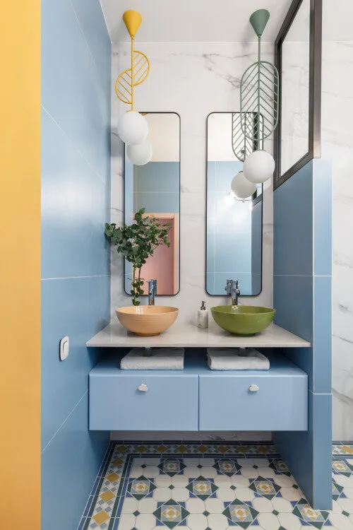 Blue and shades remind instantly the sea and it is a perfect color that contributes to beach vibes. Here, the blue walls serve a calm and relaxing atmosphere with its soft pastel tone. The wood floating vanity enhances the floor space while providing bathroom storage. The blue shaded mosaic tiles liven up the design and create a harmonious look with the blue walls and wood vanity. The colorful painting as a statement wall art fills the empty wall perfectly.