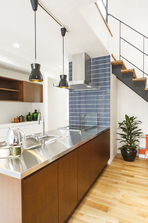 A mix of styles was incorporated between the walls of this kitchen in Nagoya. Different tones of wood on the floor and on the cabinetry bring personality to the space, the columns and beams are a great addition and an amazing way to add style. The stainless-steel countertop and industrial pendants complete the ambient.