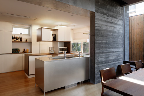 This Asian style kitchen makes a strong statement with the stainless steel island! With its brushed finish and tap to toe same material usage, this island stands out on the medium-tone wood floor.