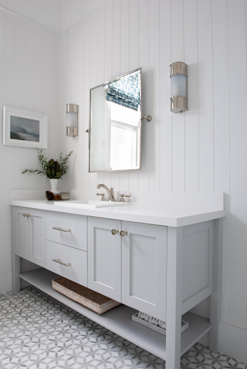 The combination of white, blue, and nickel hardware is a very popular mixture in beach-style bathrooms. And this bathroom is no exception. Employing a blue mermaid tile backsplash taken up to the ceiling, this bathroom creates a visual focal point. The white floating vanity adds soft detail to the wall and is perfectly fitted to the compact size of the bathroom. The brushed nickel bathroom accessories such as lighting fixtures, faucet, towel bar, and cabinet hardware synchronize harmoniously to create a cohesive look.