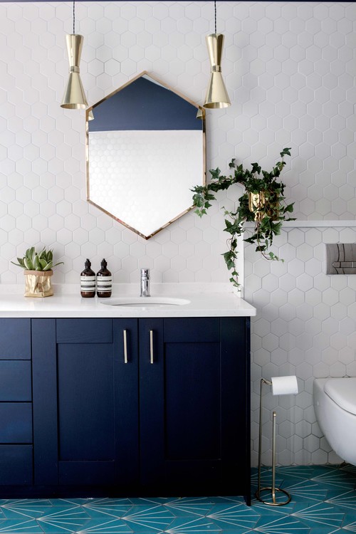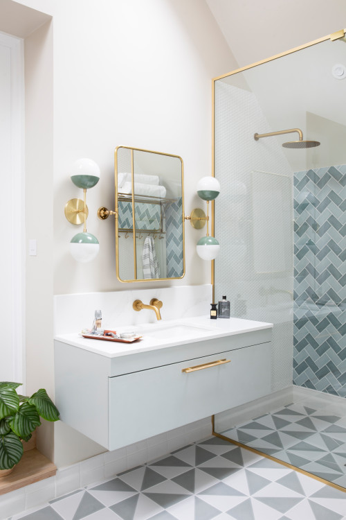 There is a myriad of ways to color and enliven a neutral bathroom design. One of them is to bring in warmth through gold hardware- as demonstrated here. And Another option is to use intriguing patterns and materials to make a statement. Here, this contemporary bathroom does both. It goes with gold cabinet handles, a gold towel rail, tapware, and a gold double-headed wall sconce to invite warmth. These luxurious additions help the design pop. Additionally, hexagon pattern floor tiles, statement marble countertops, and antique glass herringbone tile backsplash add more interest to the design. Not to mention the leafy patterns on the floor tiles that bring movement to the design.