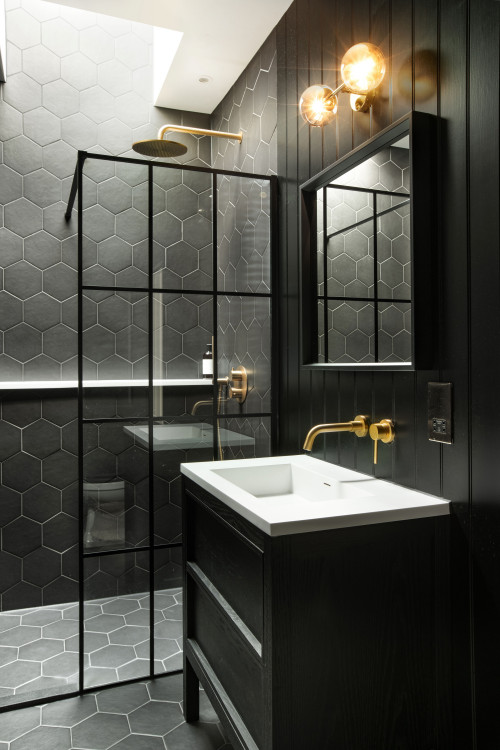 The white countertops add a clean and bright touch to the black room, while the black surfaces add a bold and sophisticated contrast. A large mirror with a black frame is mounted on the wall, reflecting the room and making it appear larger and more open. The black hexagon wall and floor tiles add to the contemporary feel of the room.