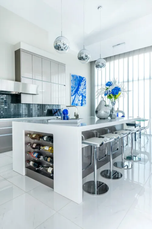 The kitchen has a contemporary and stylish design and is made out of glossy flat cabinets in white and gray that provide a strong impression. While the gray glossy ceramics on the floor harmonize with the cabinets, the black and white veined quartz countertop, backsplash application, and marble-like structure give the kitchen an opulent appearance. Built-in appliances and an under-counter sink round off the details. The room is colored thanks to a high bar counter and purple bar stools. A neutral elegance is created by the glass pendant lights over the bar counter.