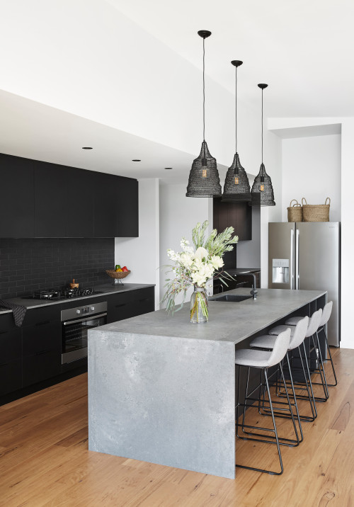 This minimalist and industrial kitchen is quite stunning because it combines concrete and wood. Taking center stage, the painted brick backsplash introduces a dramatic layer of depth and style that elevates the entire space! The introduction of light wood flat-panel cabinets infuses a refreshing luminosity that brings warmth to the atmosphere. The black metal cabinet handles and pendant lighting seamlessly encapsulate the minimalist and industrial style.
