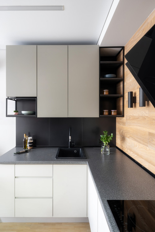 Black and White Contemporary Kitchen with Patterned Backsplash Tiles