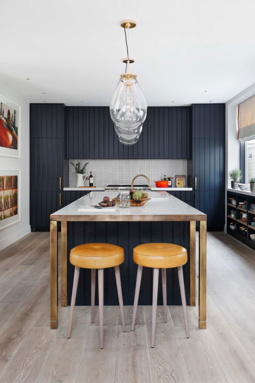 The deep and dark hues of blue create a sophisticated atmosphere in this kitchen! The navy-blue base cabinets and the brass hardware draw attention with their elegant appeal. Enriched by charcoal grout, the square subway tile backsplash creates a bright and fresh backdrop. Using brass hardware with blue colors is always a good choice since their harmony creates a stunning view. Also, brass and blue enrich the kitchen with a luxurious appeal!