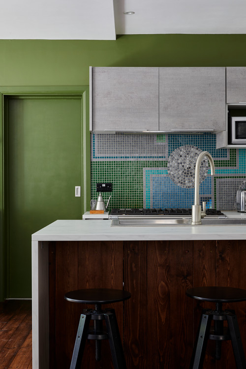 The blue, green, and yellow hues of the colorful patterned backsplash behind the stove draw all the attention! The floral patterns and the contrast between the dark green upper cabinets and create an aesthetic appeal. The wood countertops complement the backsplash colors and the natural sense of the dark green shade.