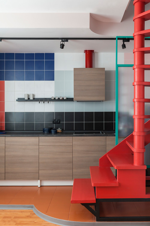 A backsplash of mirrored gold subway tiles will give your kitchen a luxurious touch and turn your old, beloved subway tiles into something truly spectacular. And to add more height to the kitchen, pair them with white, slender flat-front cabinets that reach the ceiling. Dark wood flooring can complete the look, as this modern Moscow kitchen expertly demonstrates. Those seeking luxury and glitz will undoubtedly find their appetites satisfied by the final plan.