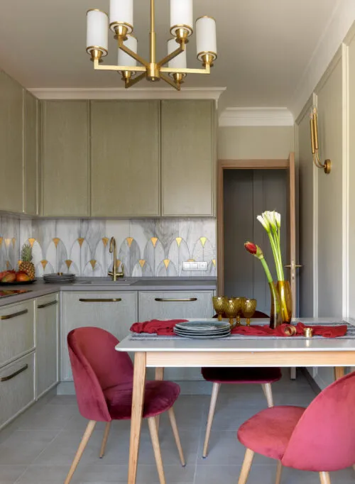 This rich kitchen looks stunning thanks to the beautiful gray fancy kitchen backsplash with gold details. The delicate pattern on the backsplash makes it unique immediately. Preferring gold flat panel kitchen cabinets grabs all the attention to the fancy backsplash. Also, using gold only on the backsplash area is a good way to highlight the backsplash. The plain white and wood dining table blend perfectly with the golden kitchen look. Using natural tones on the other kitchen areas helps prevent the environment from being too much gold. Thus, white tile floors and velvet red dining chairs are good choices to balance the kitchen look.