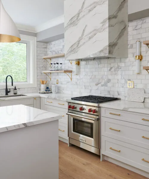 The dazzling effect of the golden fancy kitchen backsplash makes this contemporary kitchen fashionable. The harmony between gold, wood, and green is deniable. The wood kitchen cabinets and green velvet barstools invite nature to the space and provide a cozy and heartwarming feeling. The reflective gray stone floors blend perfectly with the gold backsplash. Also, the flooring lights the kitchen space and increases the contemporary kitchen look. The mirror-detailed range hood and pendant lights add an industrial vibe to this stylish kitchen.