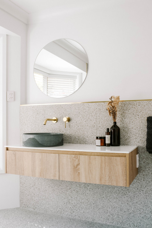 The black-flat panel cabinets and tiles provide a striking contrast to the white countertops and walls while the terrazzo floor tiles bring a dynamic and joyful appeal to the bathroom’s general view. The round sink adds a contrast, too, in terms of geometry. The arched-top frameless mirror creates an illusion of depth in the bathroom.