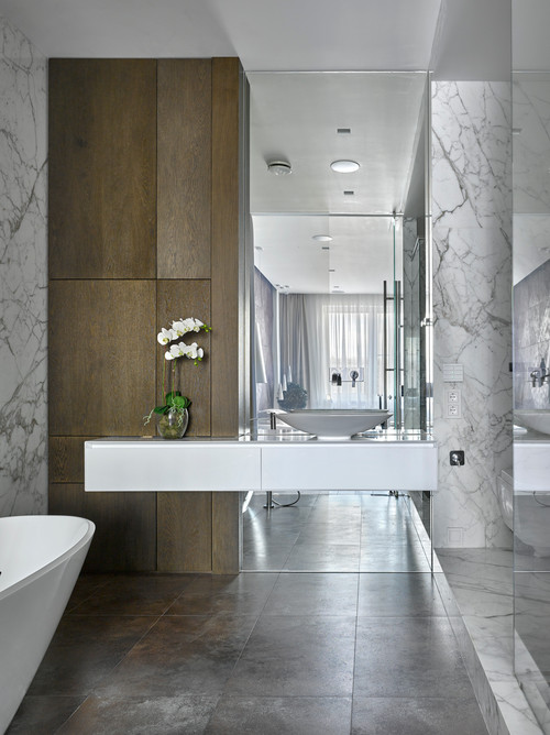 Contemporary Floating Bathroom Vanity Ideas with Marble Countertops and Backsplash
