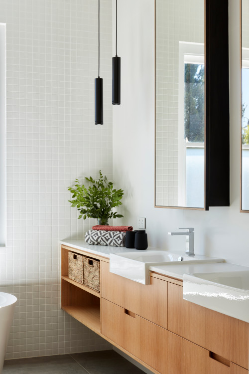 This Scandinavian-inspired bathroom features a floating vanity with flat-panel cabinets made of light wood and a white countertop. Double under-mount sinks, black cabinet hardware, and black wall faucets round out the contemporary design. A frameless mirror and a backsplash composed of herringbone tiles provide interest and texture.