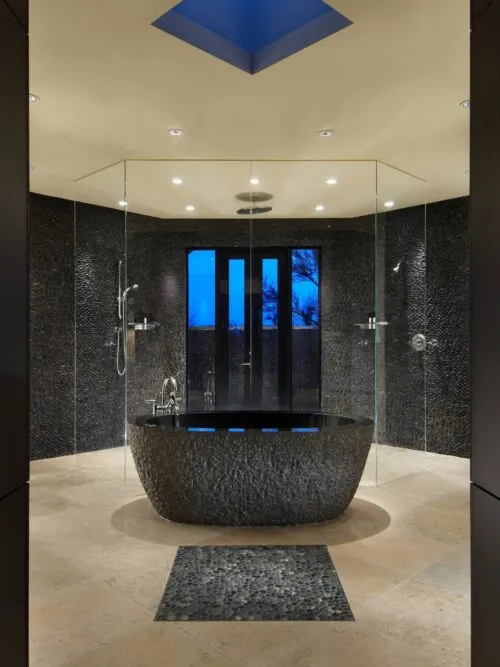 The black freestanding bathtub is carved out of a single piece of granite and it creates a distinctive focal point in front of the huge shower with stacked pebble stone walls. Pebbled stone walls complement the tub while glass enclosures of the shower create a seamless look. The small rectangular skylight highlights the tub.