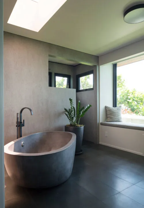 This tonally calming and understated master bathroom features custom-formed concrete wall tiles, terrazzo floor tiles, and a custom-made freestanding bathtub. The unique sculptural shape of the tub serves as artwork.